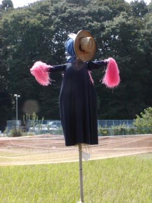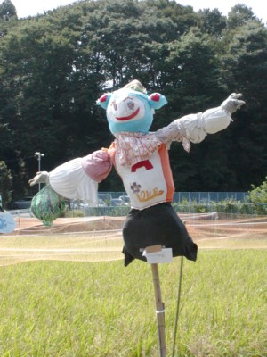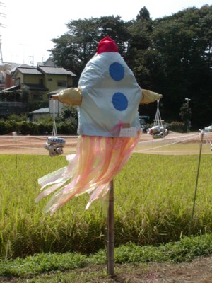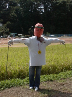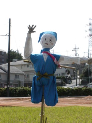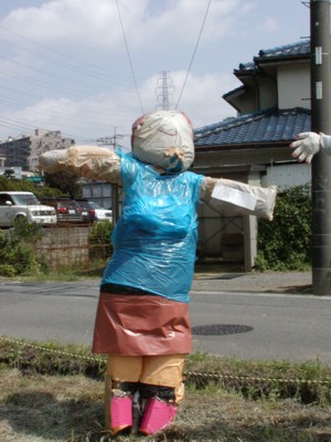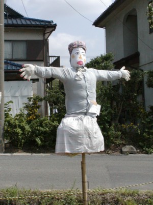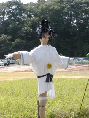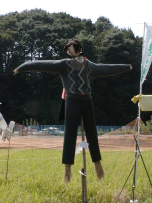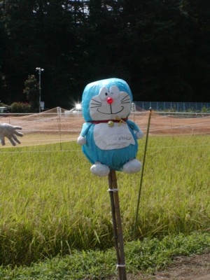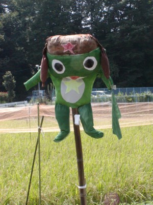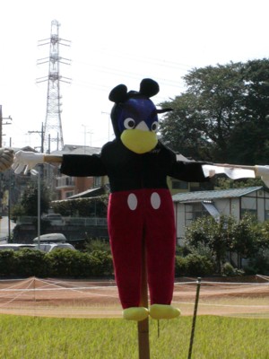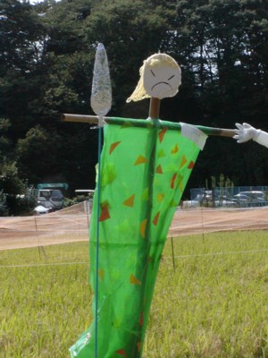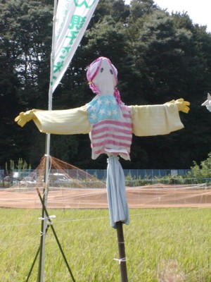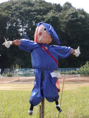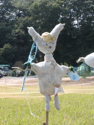 ついに、稲の収穫の時期が来てしまいました。 2,3週まえ、某TVで、「藤原さんちの田んぼ」という番組をチラと見ました。 藤原さんは豊岡市のかたで、この方の田んぼは、一切の農薬を使ってないのです。 みずすまし、ゲンゴロウ、カメムシ、ドジョウ、鮒、 それこそ昔の田んぼにいた生き物がすべている田んぼです。 農薬を使うと、メタンガス,炭酸ガスが発生して、それが地球温暖化の一因になるのだそうです。 とうとう、「蛙のコーラス」を聞く事は出来なかった今年の古沢の田んぼ! 今年の案山子は、コンクールではなかったようで,18体の参加でした。
