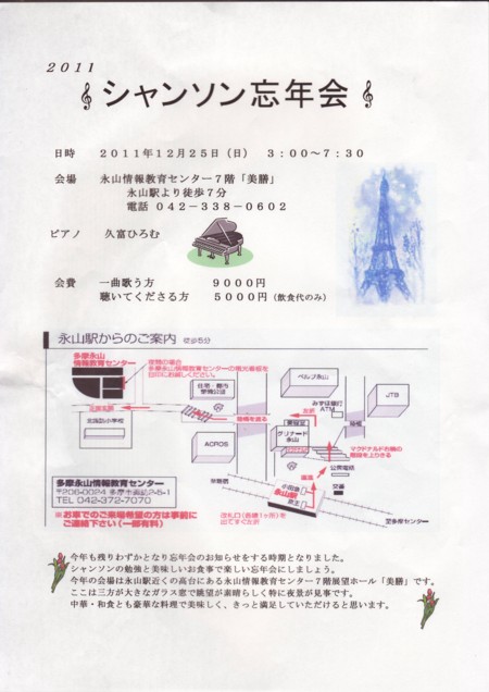 シャンソン忘年会のお知らせです。多数のご参加をお待ちしています。お申し込み・小原 042-371-0144