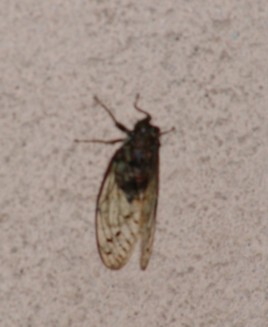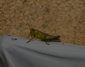 夜の訪問者 (8月17日夜9時半ごろ帰宅すると、昨年は蜻蛉だったが 今年はツクツクホウシが(ピント悪く残念))そして次の日昼はトノサマバッタがMTBの上に