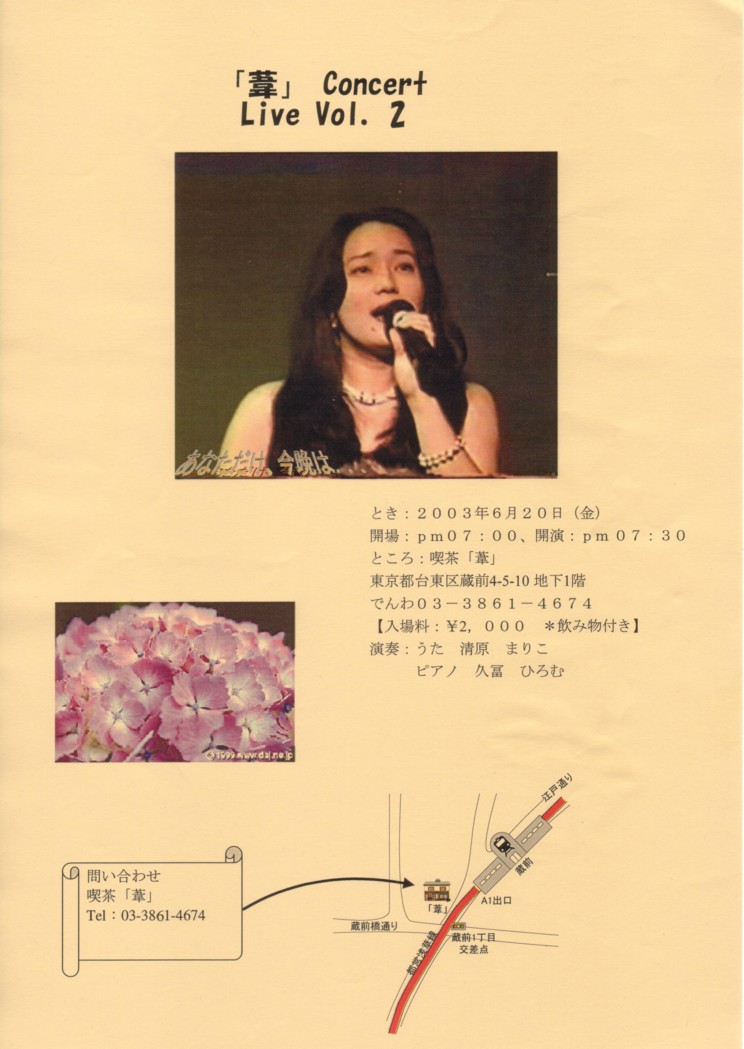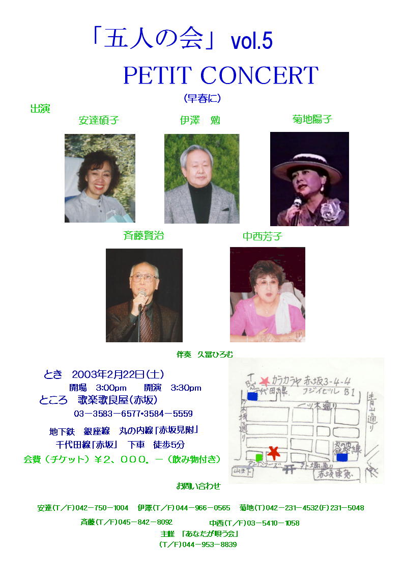 「あなたが唄う会」アニヴァーサリーへのお誘い「会」も97年に始めてから、6年が経ちました。 何人かの会員から、「こんな会が・・・」とのお話を受け、企画しました。 都心のホテルで「あなたが唄う会」を催すのです。皆さんのお祭りですね。 唄う方は30名ですが、お客様としての参加はどなたでも自由です。 とき 11月24日(振り替え休日)午後5時〜8時30分 ところ 帝国ホテル 孔雀南の間(二階) 募集人員 30名(唄う方・1曲)お客様 30名まで お食事(着席ビュッフェ)お飲み物(シャンパン・ワインなど) 伴奏 久冨ひろむ トリオ 参加費用 唄う方 30,000円 お客様 15,000円 *唄う方は、お客様をお呼びする必要はありません。 ご希望の方は、最愛の方とご一緒に、帝国ホテルのお食事が楽しめます。 *定員(30名)になり次第、締め切ります。 *お客様の予定は、やはり30名で締め切ります。 皆様のご連絡をお待ちしております。 「会」044-953-8839(T/F)メールはこちらで