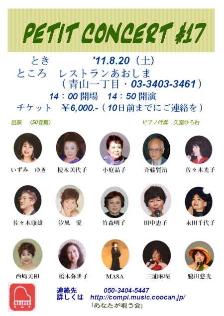 プテイコンセール#17 です。 '11.8.20(土) レストラン あおしま(3403-3461) 14:30 チケット¥6,000.-(8月10日までにご連絡を)