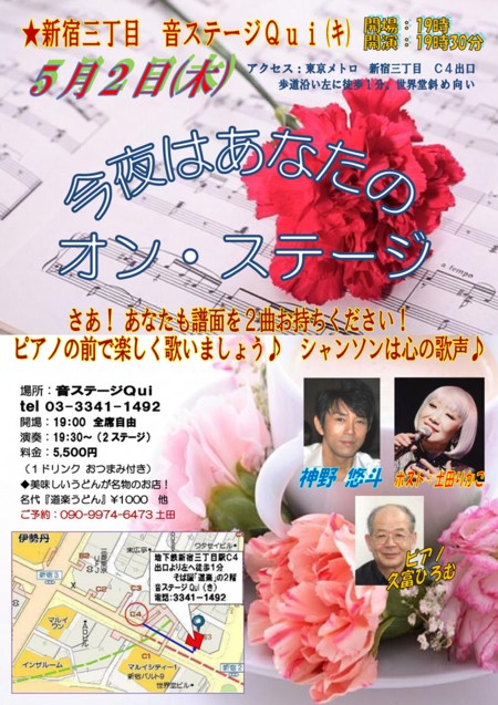 2(木)ライブ出演・音ステージ Qui・りかこ、悠斗とひろむ・唄えます(楽譜持参)19:30[地図](新宿・03-3341-1492)応援をよろしくお願いします。 5月 7日(火) -六本木ピギャール- 弾き語りあり 御客様唄えます! 開場18:30 5000- 港区六本木4-4-11第一ビバッレジビルB1 03-3408-9103