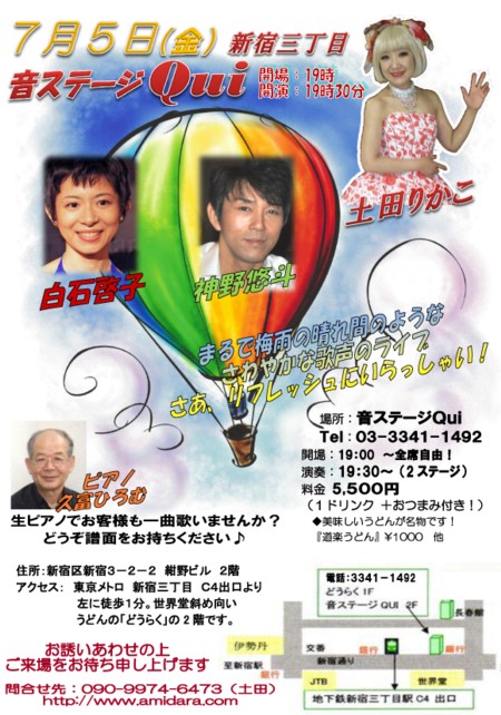 5(金)ライブ出演・音ステージ Qui・りかこ、悠斗と啓子・唄えます(楽譜持参)19:30[地図](新宿・03-3341-1492)